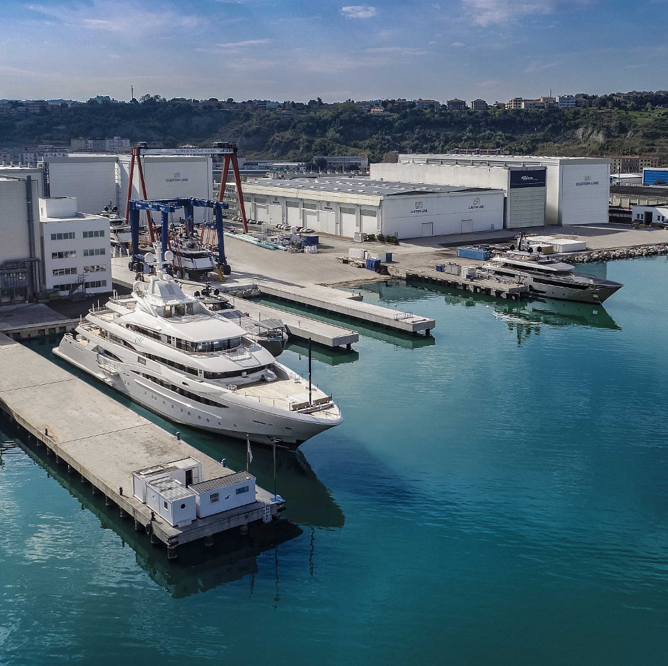 定制法拉帝游艇完全在位于意大利安科纳的超级游艇基地建造。这个面积达80280平方米的厂区内拥有专属的战略性设施与最新一代生产工具。除定制法拉帝的半定制与全定制游艇之外,法拉帝集团旗下其他品牌的金属船体游艇(长度上至90米)也都在此诞生。 展现在船厂面前的水域是一处独特的空间,这是宝贵的资源,是通往亚得里亚海的门户,也是作用巨大的专属码头。这片水域沿海岸线延伸250米,提供大型泊位,最多可同时停靠15艘超级游艇进行装配整修,并进行测试和检验,直至每艘游艇交付。船厂拥有一个670吨的龙门吊,可完成长达50米的合金或复合材料的船艇下水,也可拖运游艇进行测试。船厂设施包括九个现代化的高科技厂房,全部配有暖气、空调和综合设备。这些厂房拥有先进的空气抽排、空气压缩和中央特种气体系统、供暖和发电系统、以及两台用于搬运和安装船上设备的行车。这些厂房最多可同时建造24艘超级游艇。